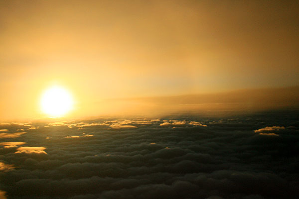 機内で JALの場合、機内では夕日を眺められる右側の席をお勧めする。成田便は充分に、関空便でもそれなりに楽しめる。