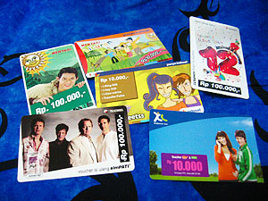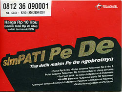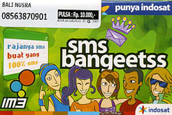 もっとお勧めなのは、3G対応の携帯電話を買ってしまえば、ドコモやソフトバンクのSIMをいれて日本でも使うことができます。そして、何よりも通話料金が安い・・・。日本の携帯に電話してもIM3のように1分850ルピアなんていうのもあります。今のレートなら1分8円ですよ・・・。もちろん自分専用のインドネシアの番号が使えます。 SIMカード さて、インドネシアの携帯はプリペイド式のSIMチップ(FOMAに入っているのと同じ形)のものを電話機にセットして使います。何社かの携帯電話会社がありますが、いちばん有名なのがシンパチ、そしてインドサットのムンタリに、XL などなど。まずはこのカードを10000ルピアぐらいで買います。電話番号と10000ルピア分の通話料が付いてきます。 最安値はついている通話料と同額ですが、外国人だと思うと1枚100000ルピア以上でふっかけてくる場合もありますので気をつけてください。イイ番号だと高い場合もありますが、何でもない番号なのに・・・なんてこともよくあるようです。 SIMのチップの部分を取り外して電話機にセットし、登録すればすぐに使えます。 登録はお店の人がやってくれますので、生年月日や名前の入ったパスポートのコピー等を持って行くとイイでしょう。以前は上の3社とも日本でもローミングで電波が入りSMS等が使えましたが、今ではインドサットは使えなくなりました。