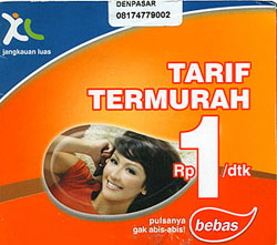こちらもCDMA方式。桁数は一桁多いものの、0361−9******というウブドもどきの電話番号が取得できます。クタなどのお店の電話でも0361−7******というような7桁番号はフレキシーのSIMを電話機の底面に差し込むタイプの電話機を使っていることになります。特番使用で日本へは1分1500ルピア程度。