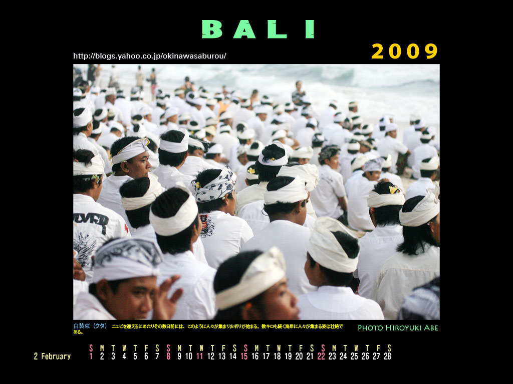 2月 白装束(クタ) ニュピを迎えるにあたりその数日前には、このように人々が集まりお祈りが始まる。数キロも続く海岸に人々が集まる姿は壮絶である。 |
