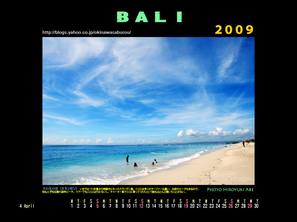 4月 手の先の雲(スランガン) いまではバリ本島から地続きになったスランガン島。ここには多くのサーファーも集い、白砂のビーチもあるので、知る人ぞ知る隠れ家的ビーチ。ツアーでもここには行かないし、チャーター車でここに寄ってくれたという話もほとんど聞いたことがない。 |
