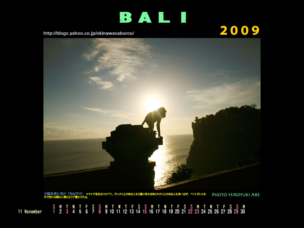 11月 夕陽を背に受け(ウルワツ) ケチャで有名なウルワツ。行ったことのある人なら猿に何かを取られたことのある人も多いはず。ペットポトルを手で空ける様は人間のようで驚かされる。 |